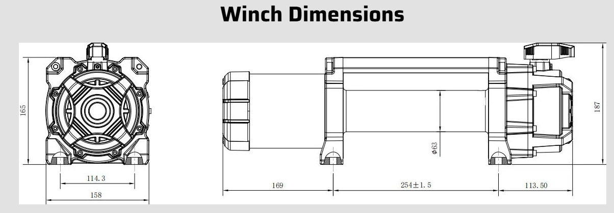 - Winch Dimensions (L x W x H): 538 x 158 x 187mm (21.2" x 6.2" x 7.4")